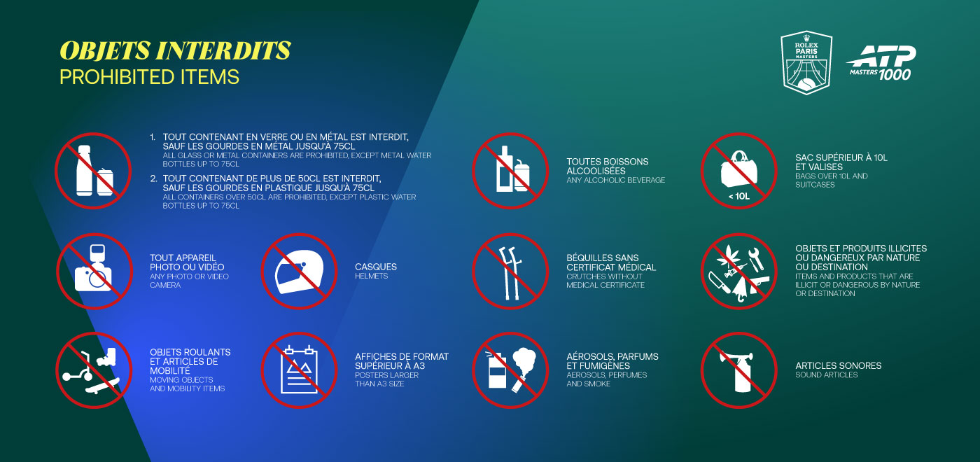Pour des raisons de sécurité, il est formellement interdit d’introduire dans l’enceinte de Paris La Défense Arena certains objets (voir la liste des objets interdits ci-dessous). Ces objets pourront être laissés en consigne à l'entrée.